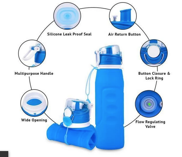 This collapsible water bottle holds a large capacity at 26oz (750ml) and folds up easily to half of its size. Wide opening makes it easy for cleaning while air return button will inflate bottle automatically, making it easy to hold and place upright when in use.