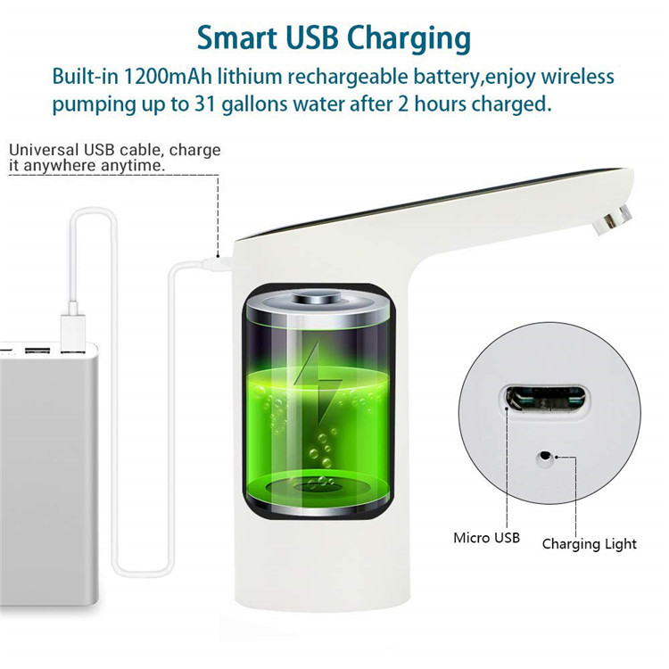 Battery: Built in rechargeable 1200mAh battery. Can used for 30-40 days or around 4-6 bottles of 5 gallon water once full charged. No need to charge every day.