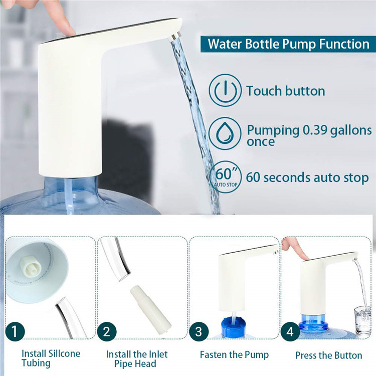 - Features: The USB Charging Water Dispenser Pump is designed for 5-gallon bottles and offers convenient and efficient water dispensing. It includes an Automatic Shut Off feature for safety and can be charged via USB.